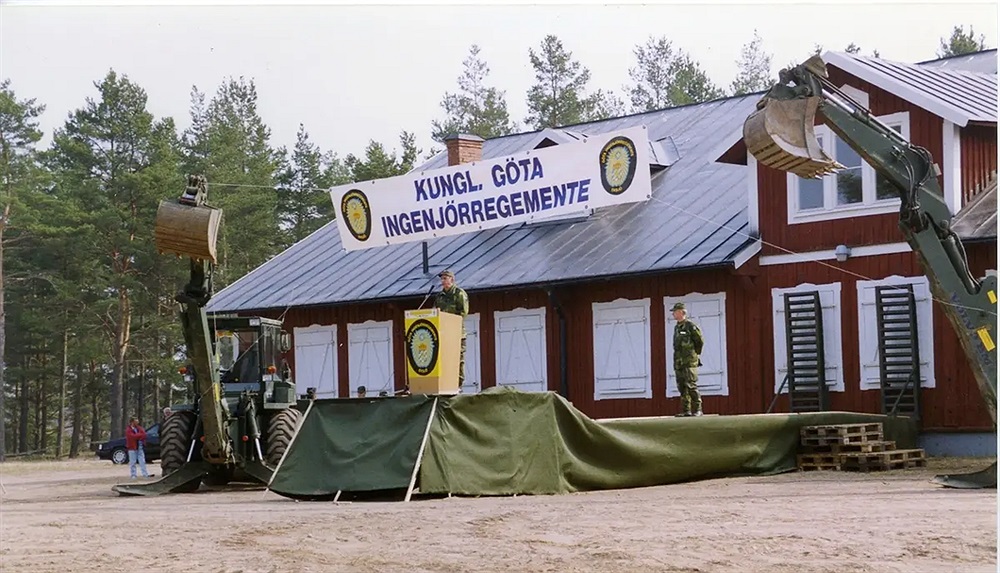 Regementets dag 1994. ÖB Bengt Gustafsson (i talarstolen) och chefen Ing 2 Björn Svensson. Källa: Milliseum